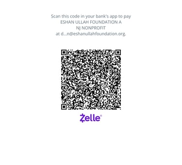 For your convenience, if you wish to make a donation to the Eshan Ullah Foundation, you can use Zelle to send funds directly. Please use the email address donation@eshanullahfoundation.org to complete your transaction securely.